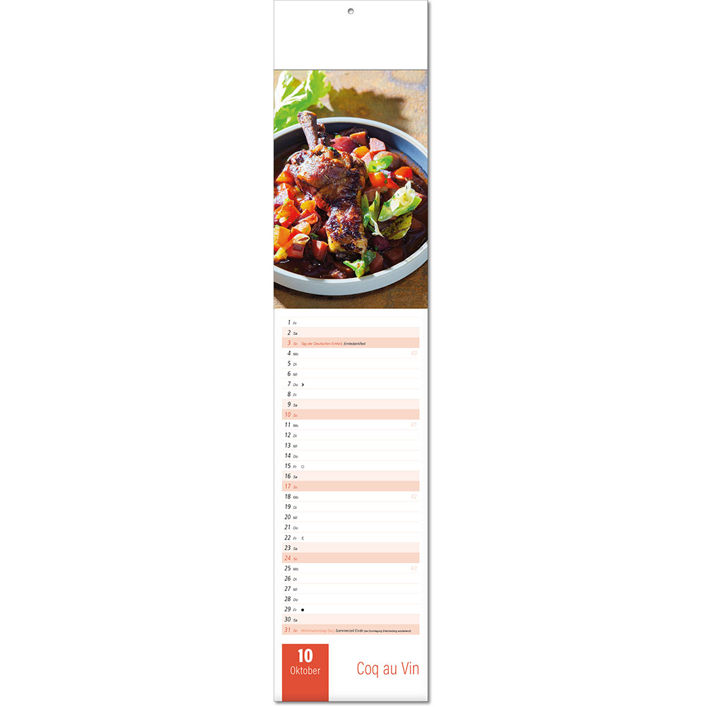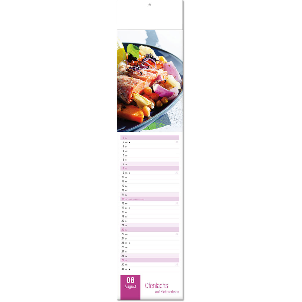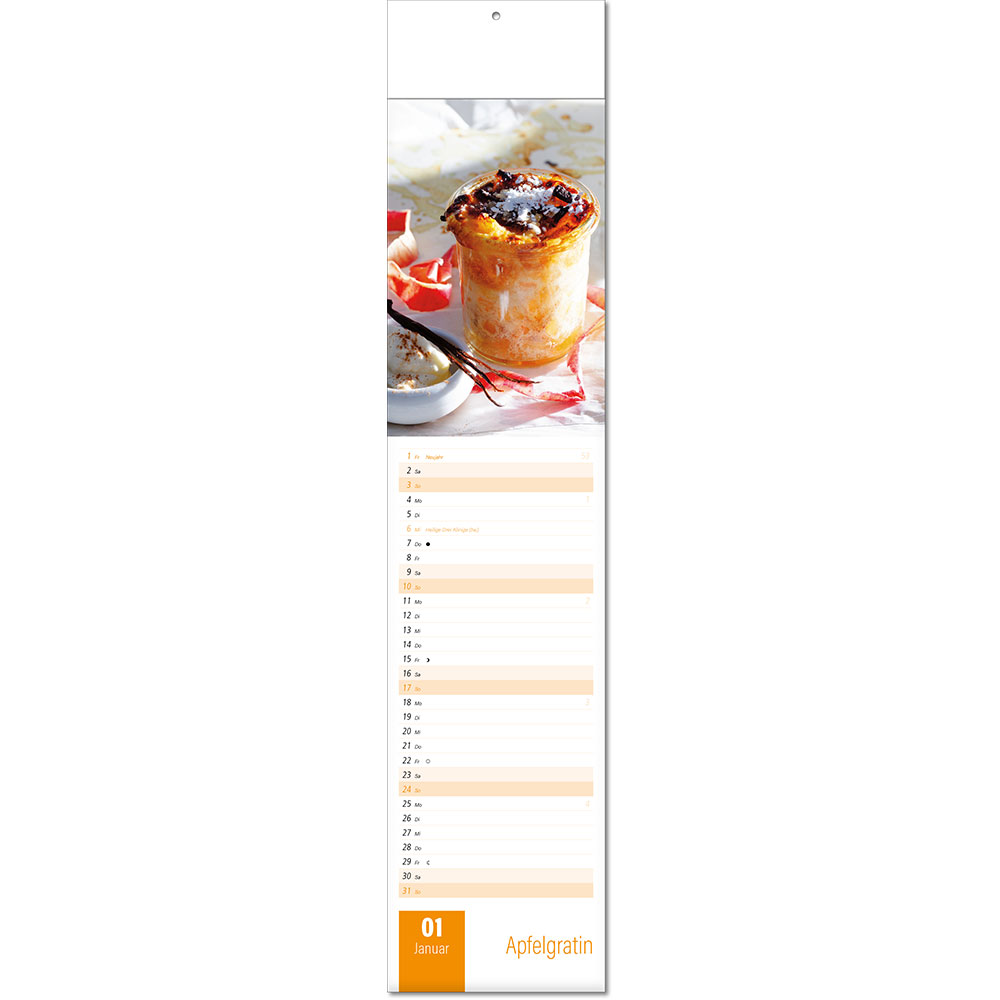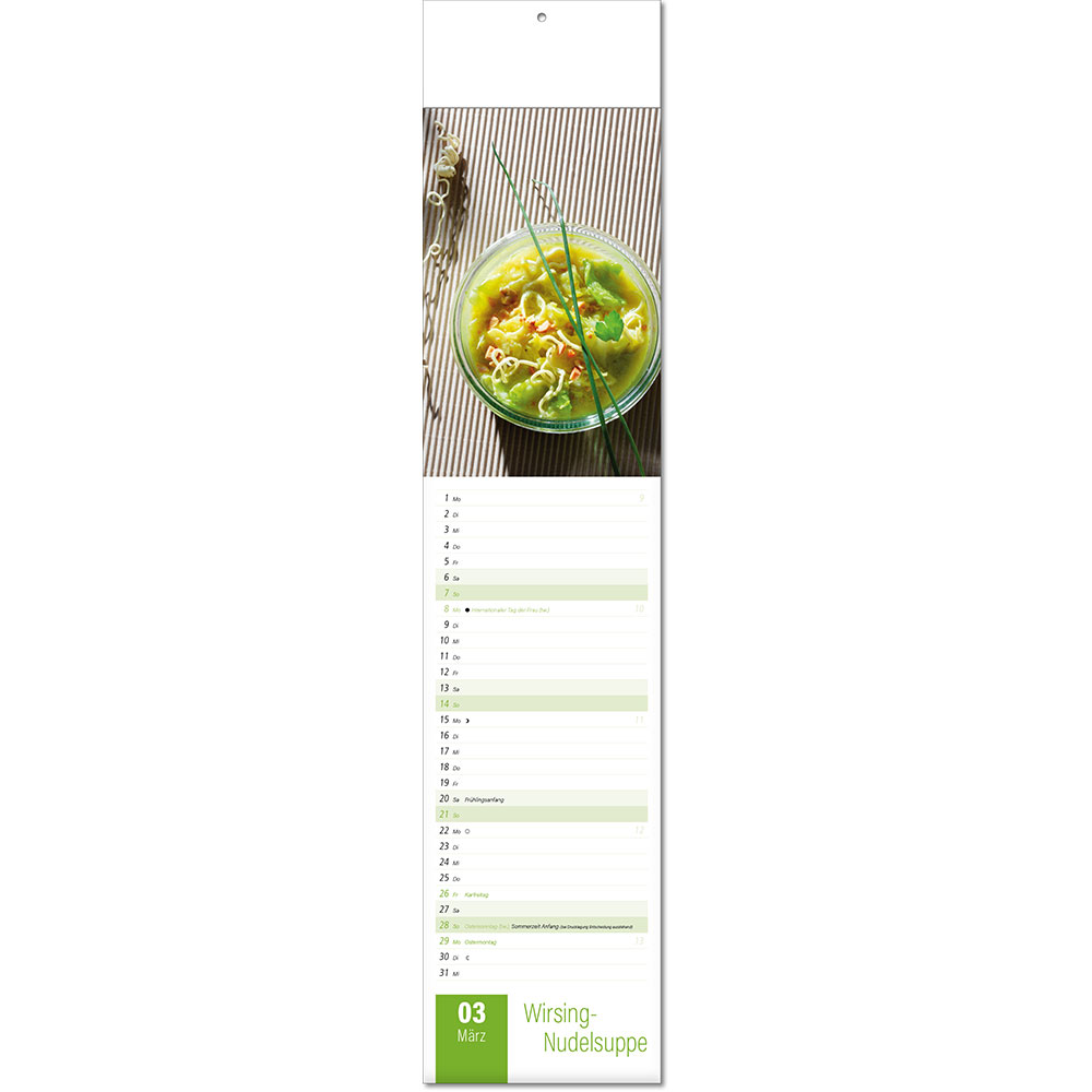 Angabe der Kalenderwoche Angabe der Mondphasen Notizfähiges Kalendarium Rückseitentexte mit speziellen Informationen |
