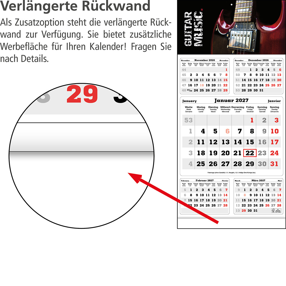 Das Klarsicht-Trägerband ist durch das Fenster (rot) des Datumsweisers hindurchgefädelt, um ein Abfallen des Fensters zu vermeiden. Optional ist eine Jahresübersicht auf der verlängerten Rückwand möglich. |