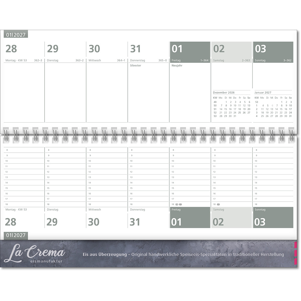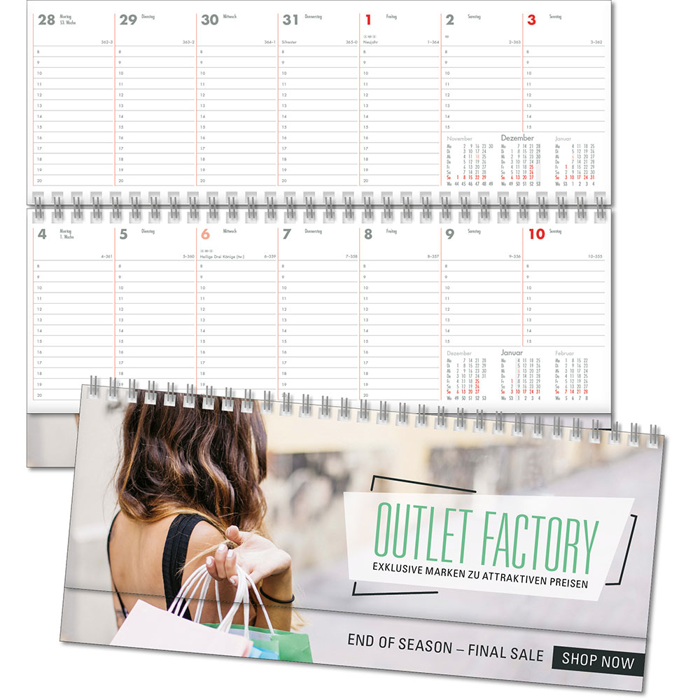 einsprachiges Kalendarium Angabe der Kalenderwochen 7 Spalten pro Woche und 2-Monatsübersicht Tageszählung auf- und absteigend Stundeneinteilung, oberes Blatt Platz für Notizen, unteres Blatt 8–18 Uhr Jahresübersichten, Ferientermine D/A/CH und internationale Feiertage |