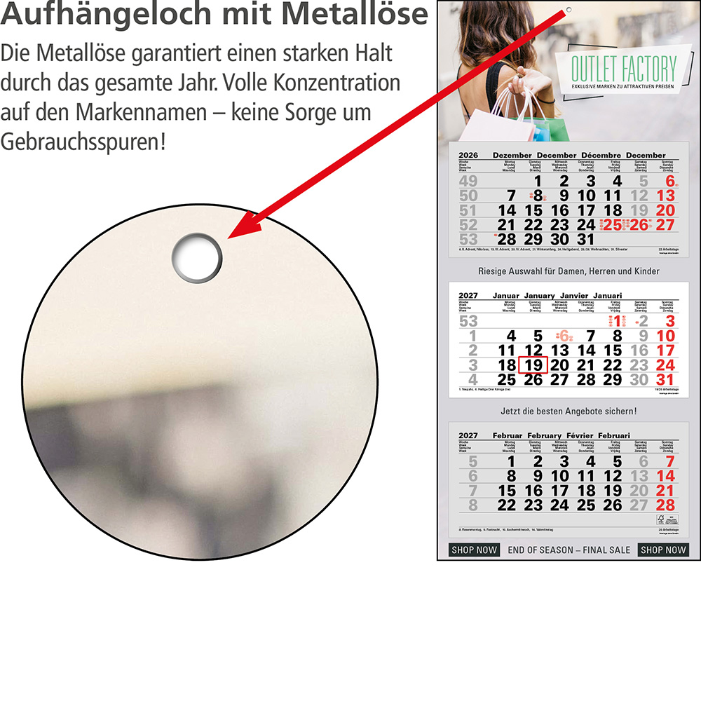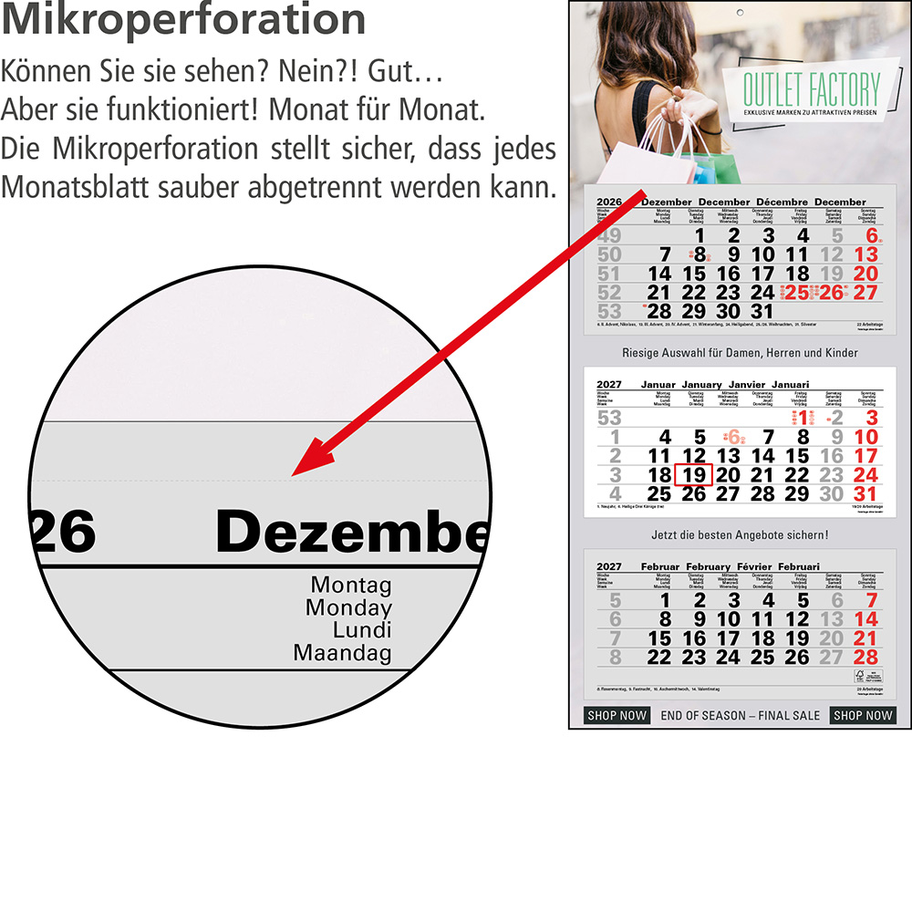 Das Klarsicht-Trägerband ist durch das Fenster (rot) des Datumsweisers hindurchgefädelt, um ein Abfallen des Fensters zu vermeiden. Der Datumsweiser ist um den Monatsblock (nicht den gesamten Kalender) umgelegt. Metallöse zum sicheren Aufhängen des Kalenders Microperforation der Monatsblöcke für ein rückstandsfreies und einfaches Abreißen der Blätter |