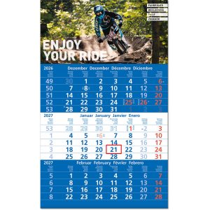 Das Klarsicht-Trägerband ist durch das Fenster (blau) des Datumsweisers hindurchgefädelt, um ein Abfallen des Fensters zu vermeiden. Der Datumsweiser ist um den Monatsblock (nicht den gesamten Kalender) umgelegt. Metallöse zum sicheren Aufhängen des Kalenders Microperforation der Monatsblöcke für ein rückstandsfreies und einfaches Abreißen der Blätter |