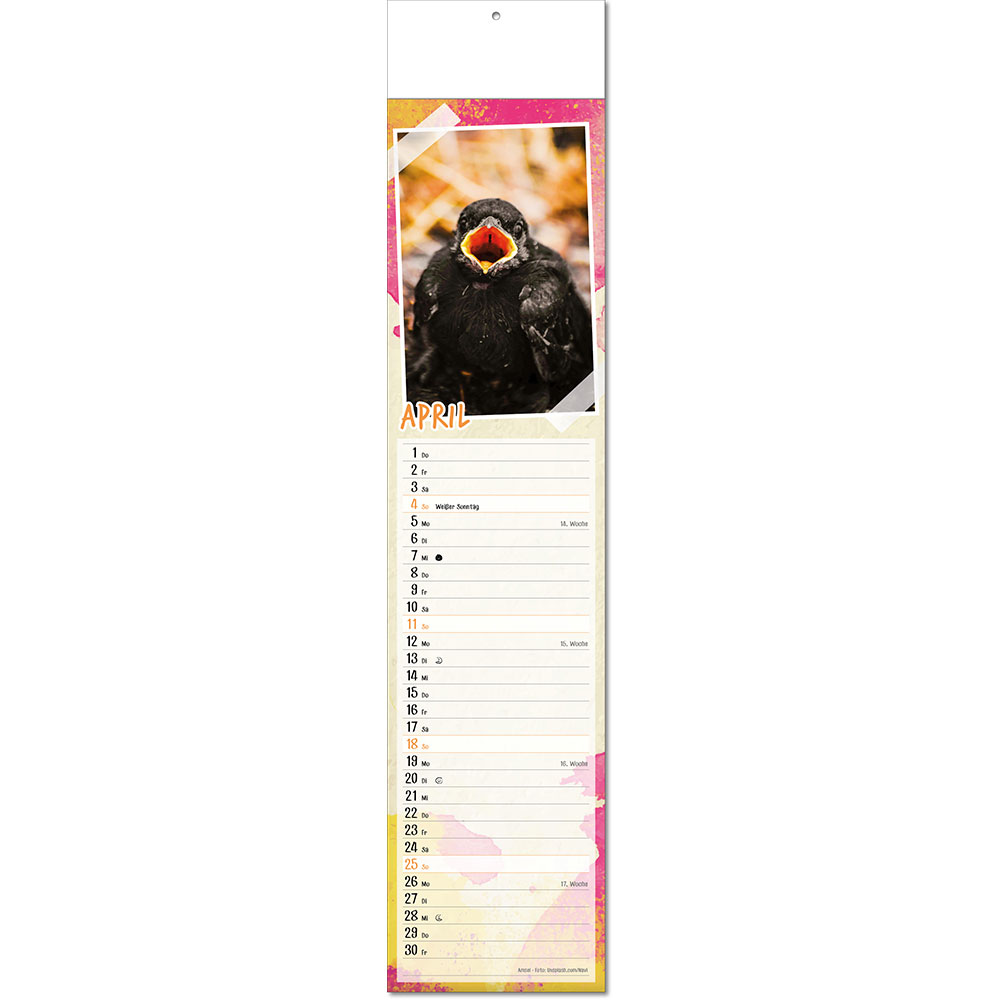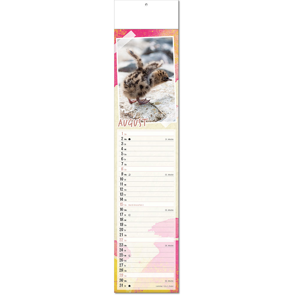 Angabe der Kalenderwochen Angabe der Mondphasen Notizfähiges Kalendarium Rückseitentexte |